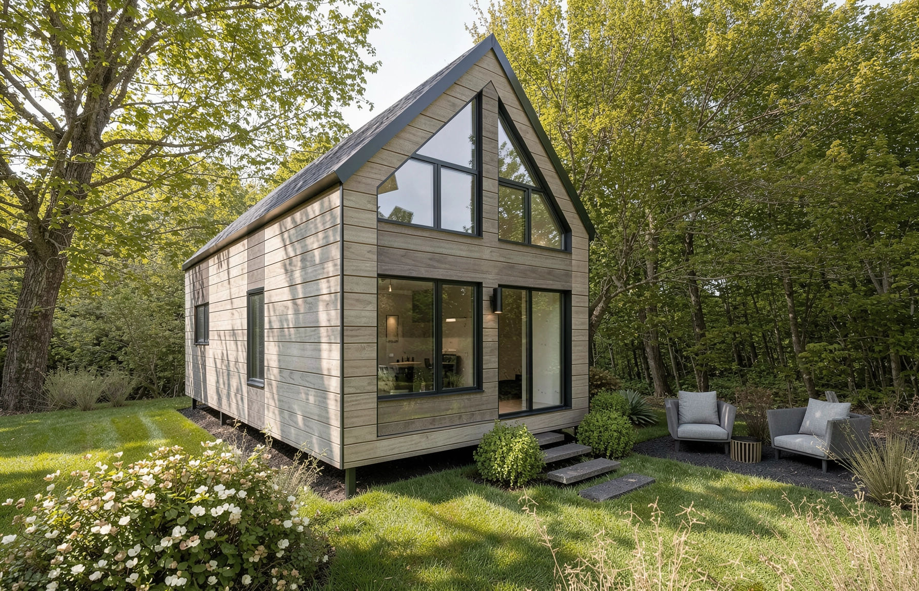 Le TÖNYK est idéal pour les escapades de week-end. Il offre un espace à aire ouverte avec une grande mezzanine. Son toit cathédral et sa façade largement vitrée inondent l'intérieur de lumière naturelle. Ce chalet est équipé de deux chambres à coucher (dont une sur la mezzanine), d'une salle de bain et d'un espace ouvert comprenant cuisine, salle à manger et salon.