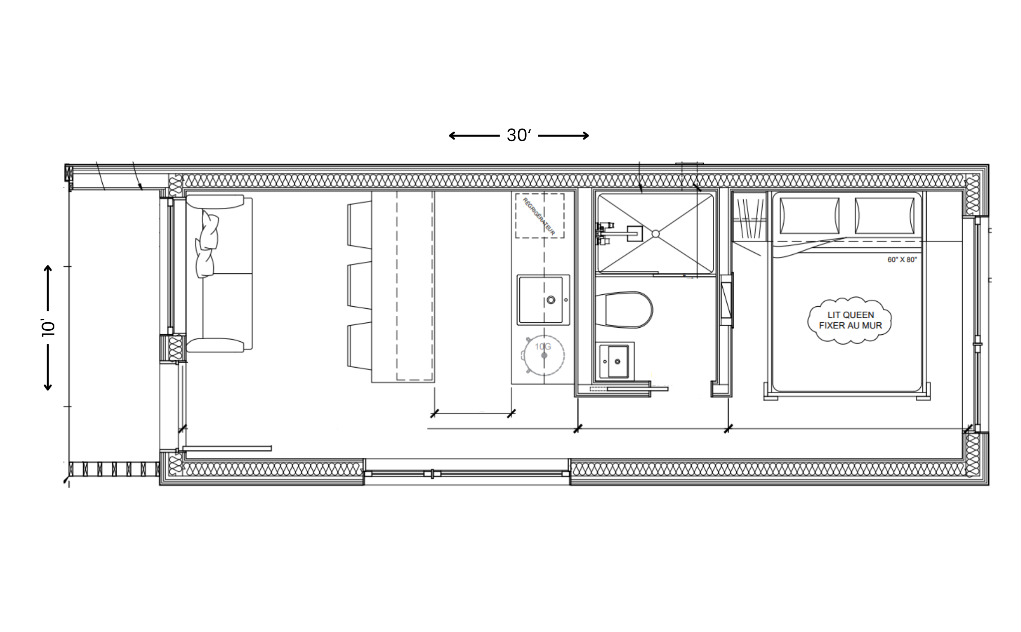 Le MÏRA est constitué d’une chambre à coucher et une aire de vie ouverte incluant une cuisinette et un salon. Étant disponible en option éco-autonome, le MÏRA peut facilement être utilisé comme camp forestier ou camp de chasse.