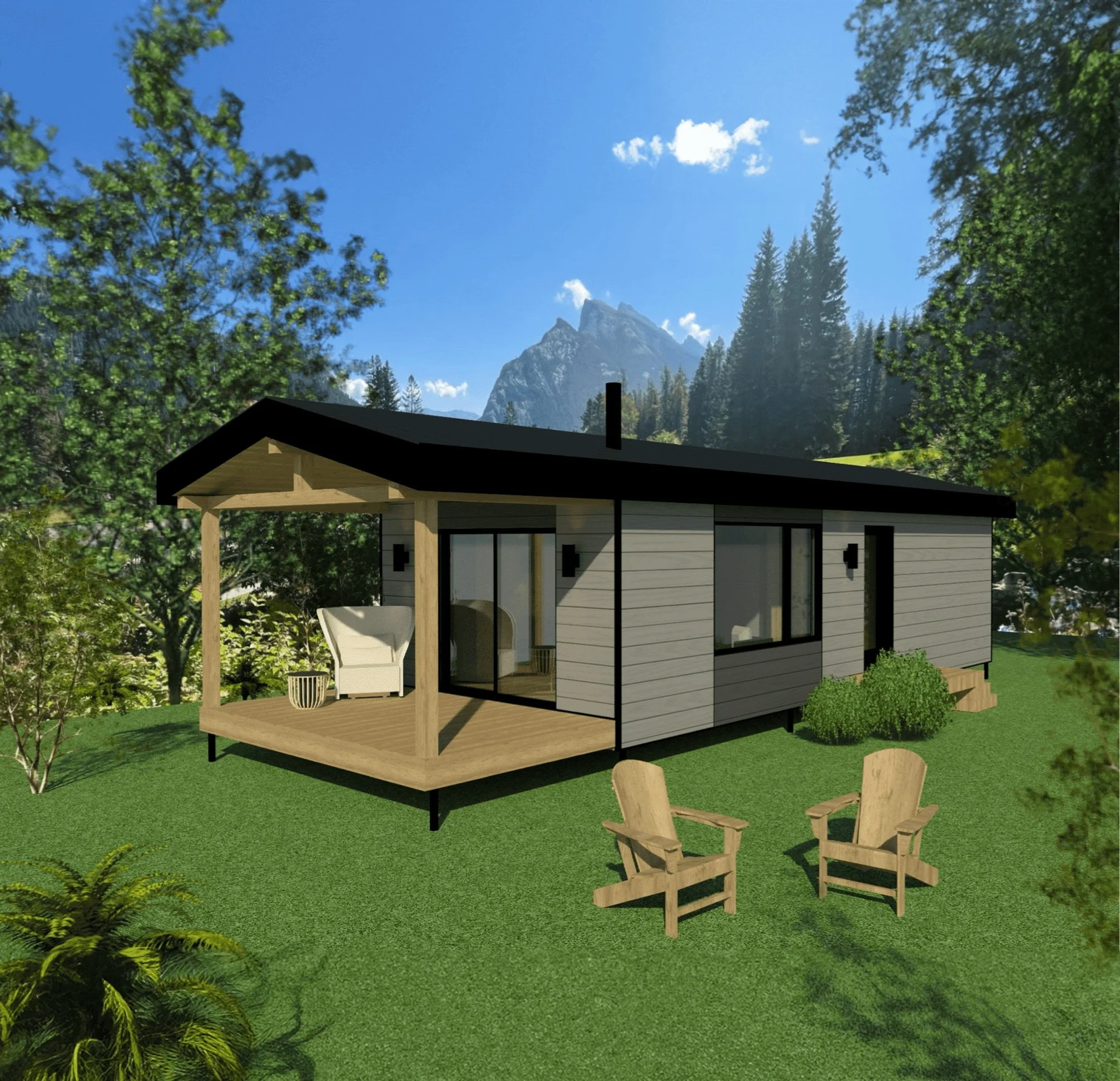 Le TERRA est constitué d’une chambre à coucher fermée et une aire de vie ouverte incluant une cuisinette, une salle à manger et un salon. Cette disposition permet de maximiser l'espace tout en maintenant une atmosphère chaleureuse et accueillante. La grande galerie couverte de 8'-0'' x 13'-0'' vous permet de profiter pleinement de la nature environnante. Que ce soit pour un café matinal ou une soirée étoilée, cet espace extérieur ajoute une nouvelle dimension à votre expérience de chalet.
