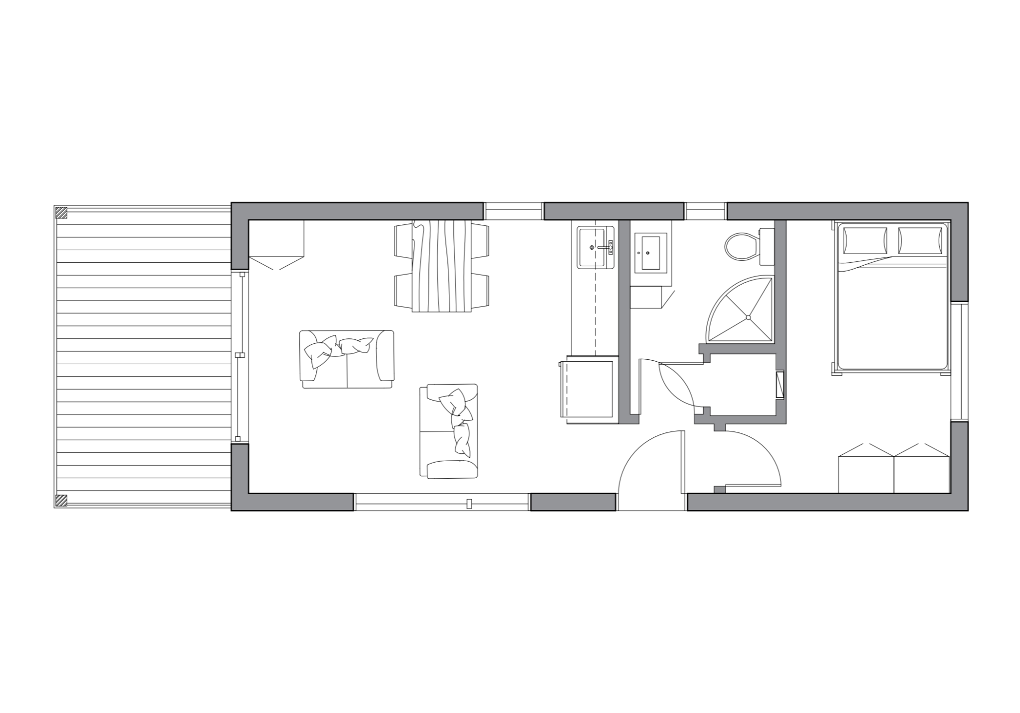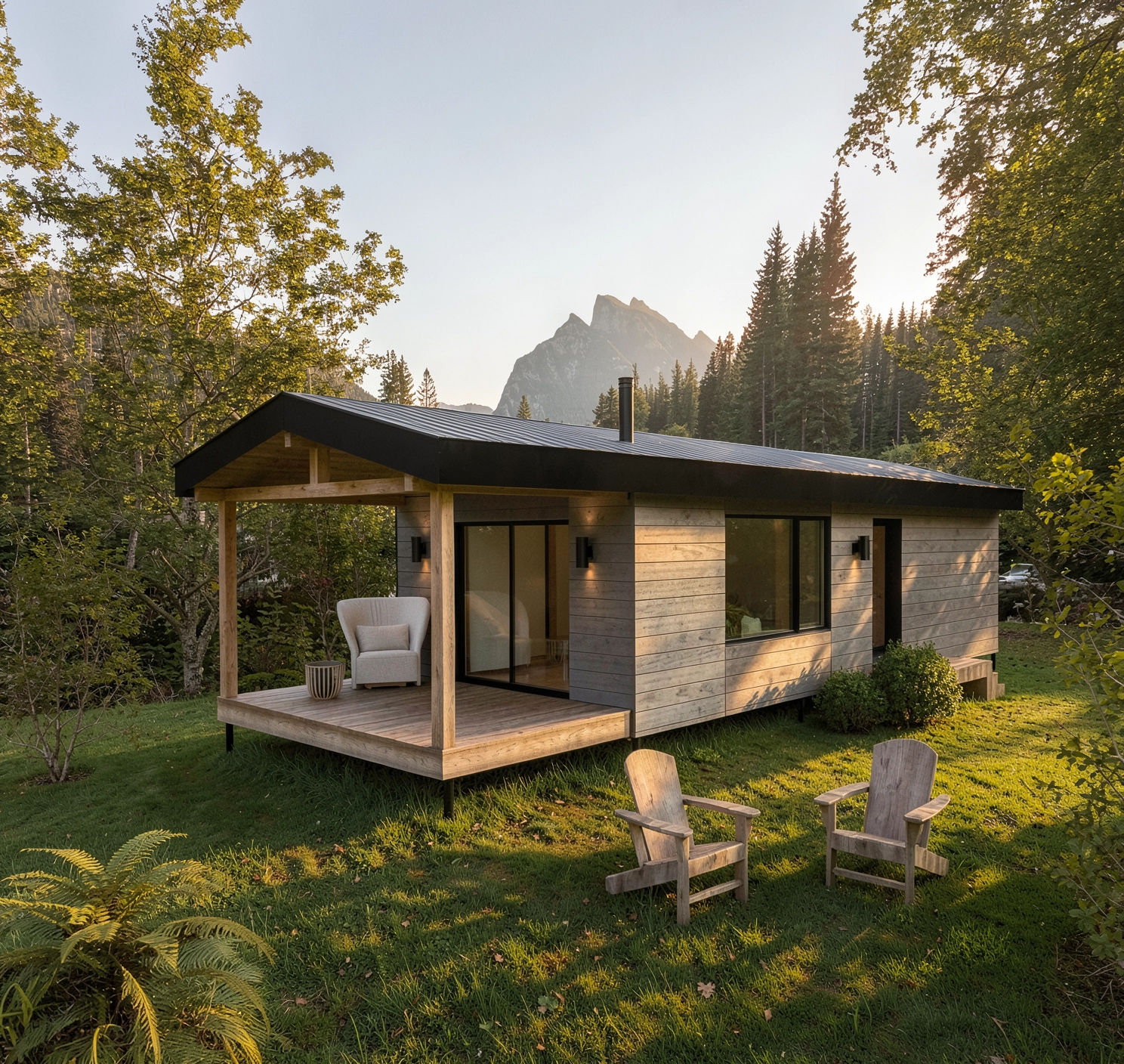 Le TERRA est une mini habitation conçu pour optimiser chaque recoin. Ce modèle est constitué d’une chambre à coucher fermée et une aire de vie ouverte incluant une cuisinette et d’un salon. La grande galerie couverte vous permet de profiter pleinement de la nature environnante. Étant disponible en option éco-autonome, le TERRA peut facilement être utilisé comme camp forestier.